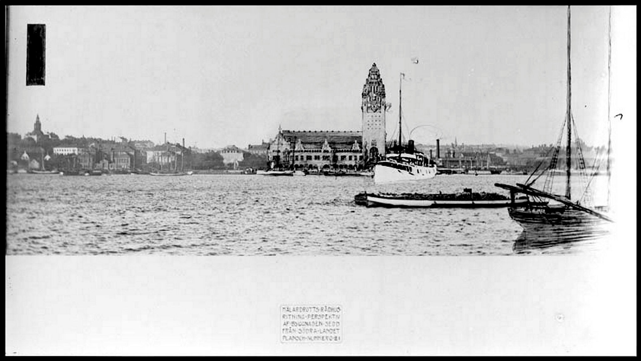 Vy över Riddarfjärden med tävlingsförslag till nytt rådhus på Eldkvarnstomten av Mälardrott.