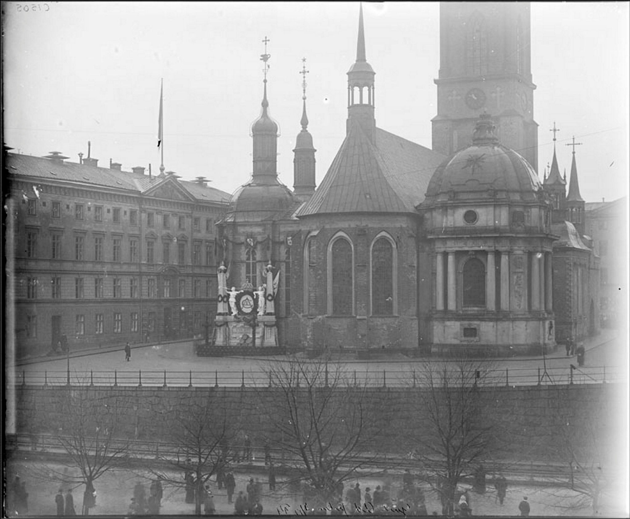 Gustavianska gravkoret på Riddarholmskyrkan dekorerat med girlanger och sköldar med anledning av Gustav II Adolfs jubileum.