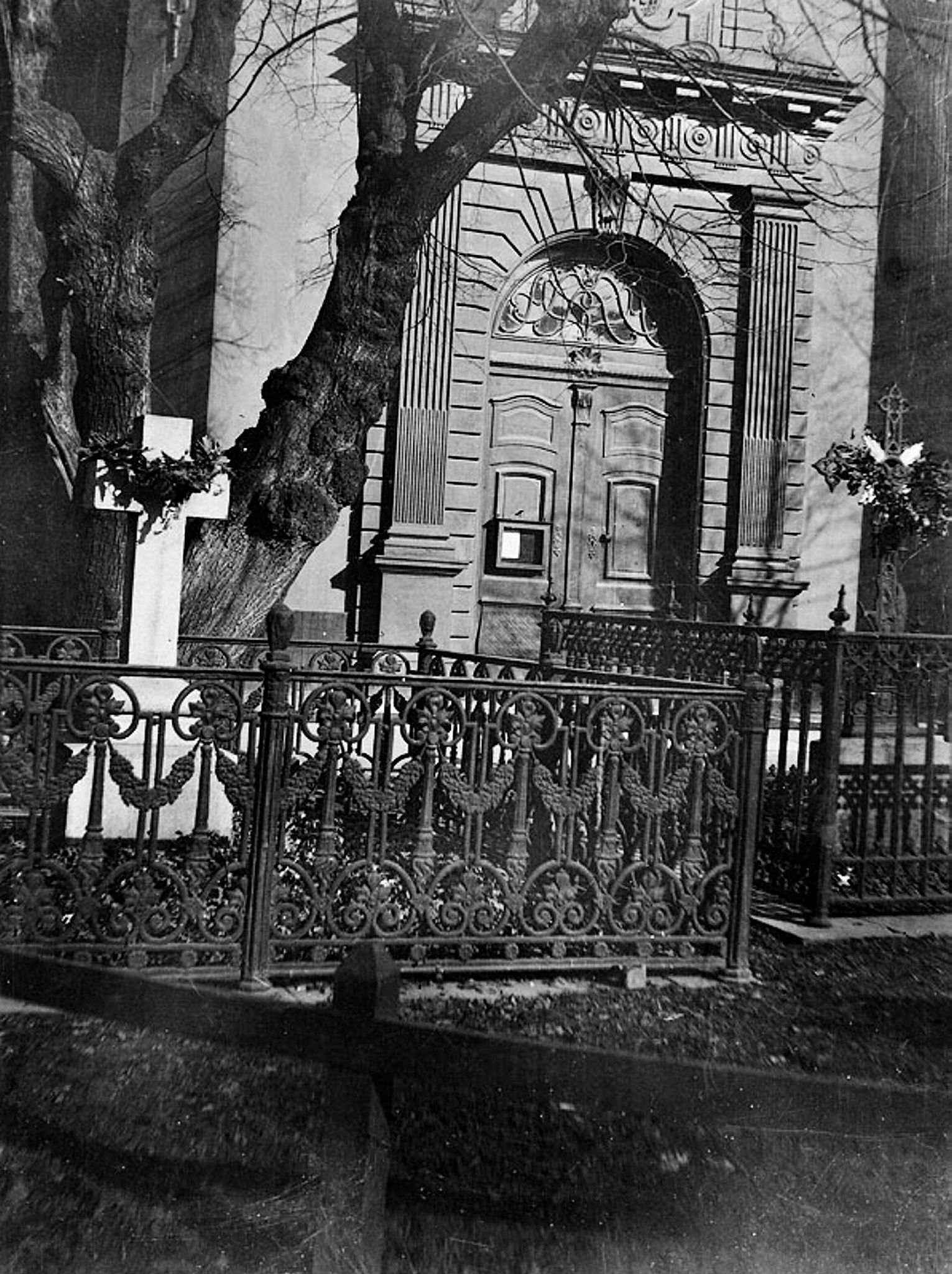 Maria kyrkas västra port och inhägnade gravar på kyrkogården.