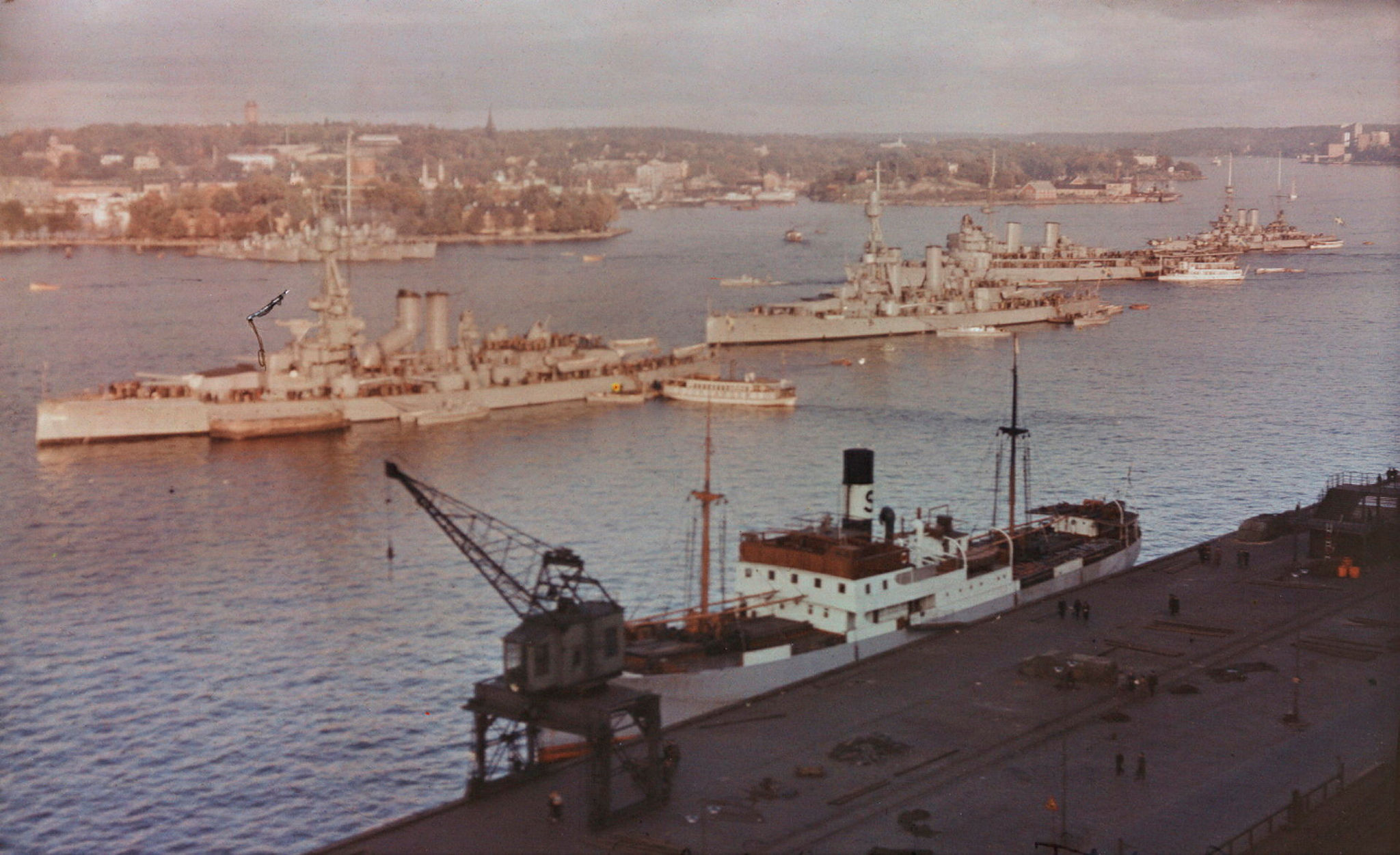 Strömmen. Kustflottan. Fartyget längst till vänster är pansarskeppet Sverige