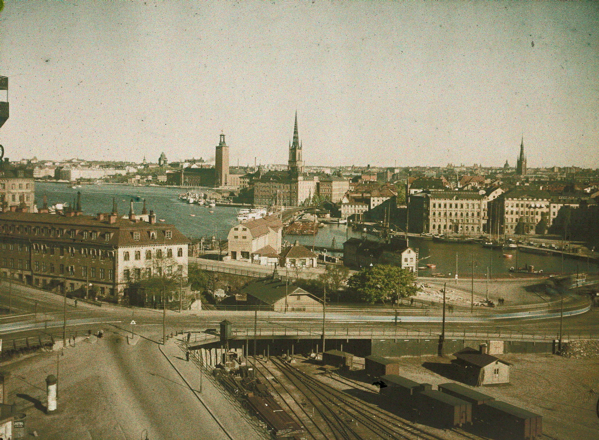 Vy från Södermalm och kvarteret Tranbodarne mot nordväst över kvarteren Järngraven Övra och Nedra mot Gamla Stan, Riddarholmen och Riddarfjärden. Till vänster i bild skymtar Restaurang Pelikan. Autokrom.
