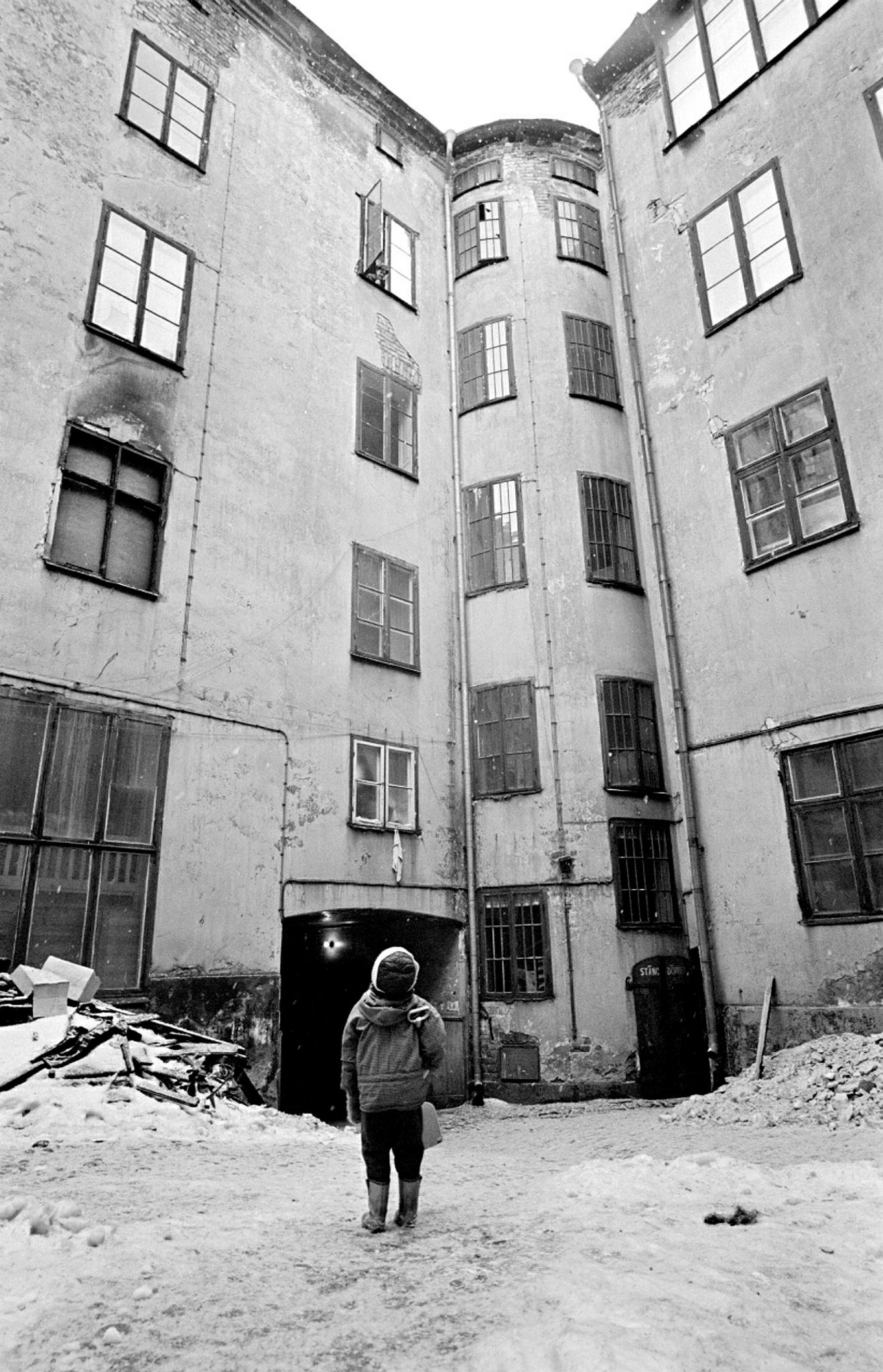 Norra Smedjegatan 5. Gårdsmiljö med ett barn på gården som pratar med sin mamma som ser ut genom fönstret på fjärde våningen.