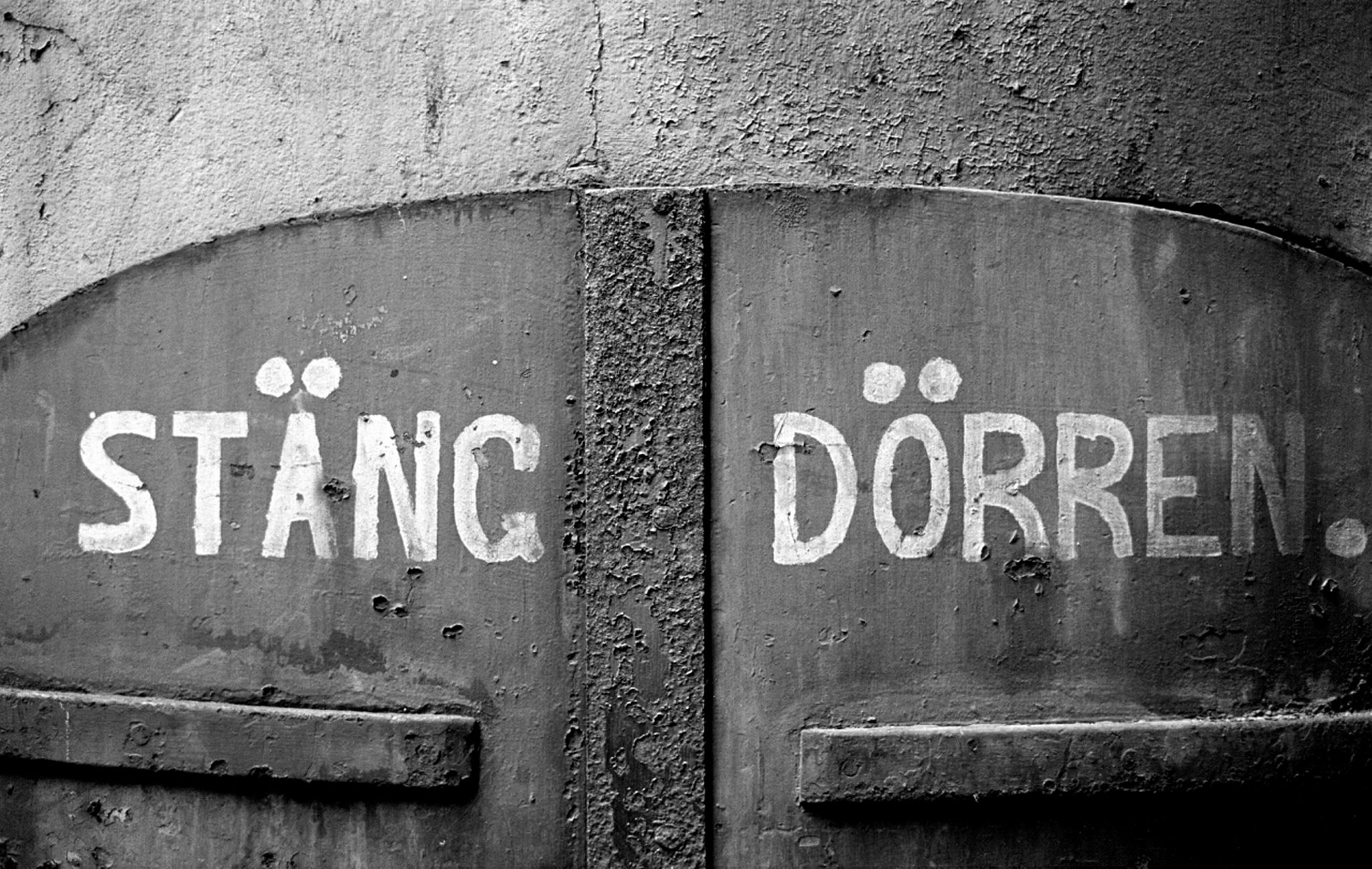 Norra Smedjegatan. Dörrpar på gård med påmålade texten Stäng Dörren.
