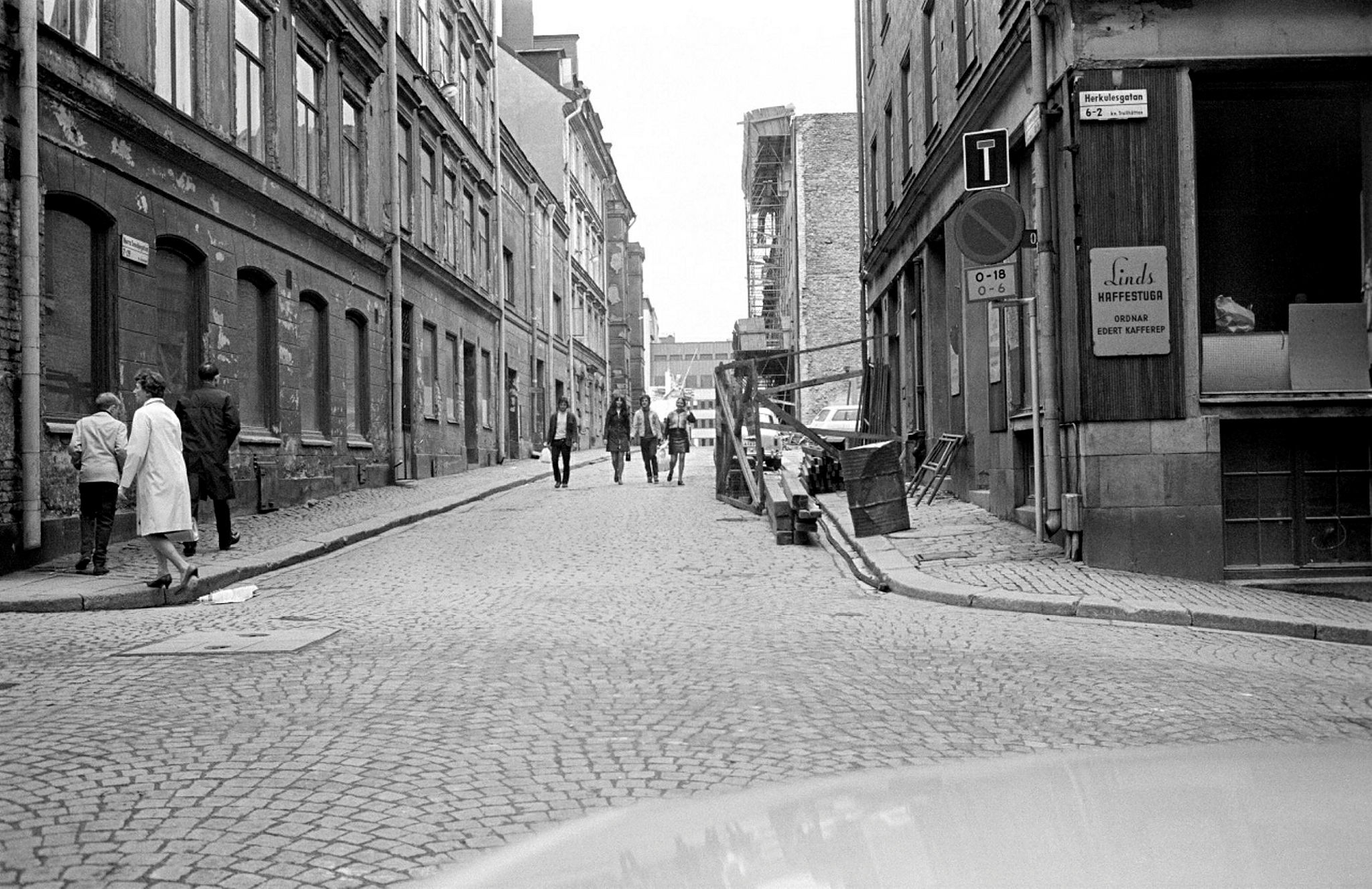 Norra Smedjegatan mot Hamngatan. Fastigheterna står tomma inför rivning.
