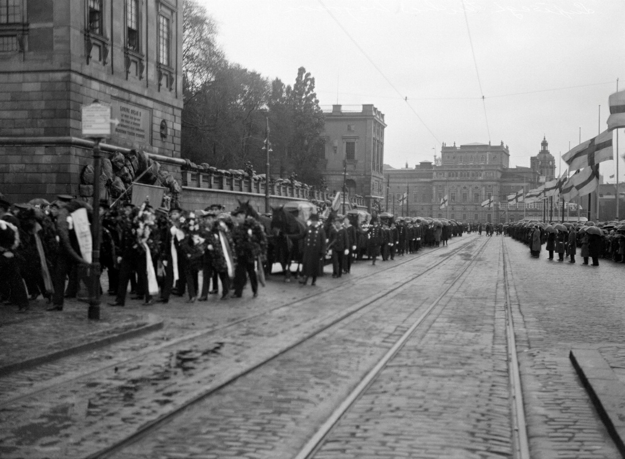 Begravningståg och katafalker på Skeppsbron med kvarlevorna efter Salomon August Andrée, Nils Strindberg och Knut Fraenkel från Andréexpeditionen. I fonden Kungliga Operan.