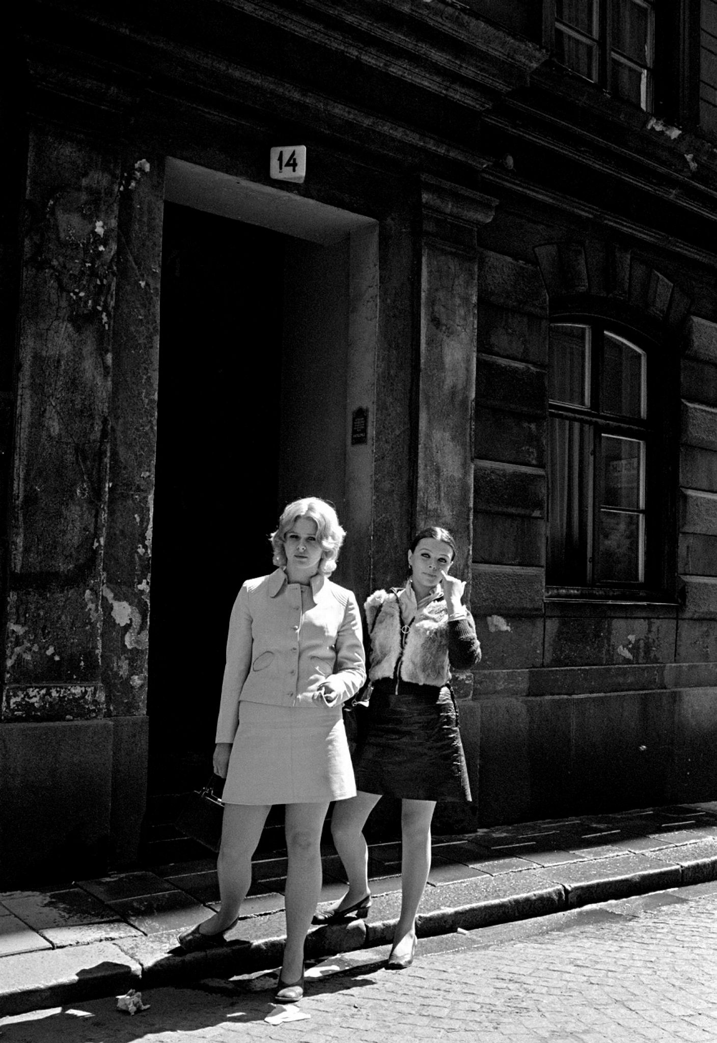 Två unga kvinnor utanför porten till Norra Smedjegatan 14.
