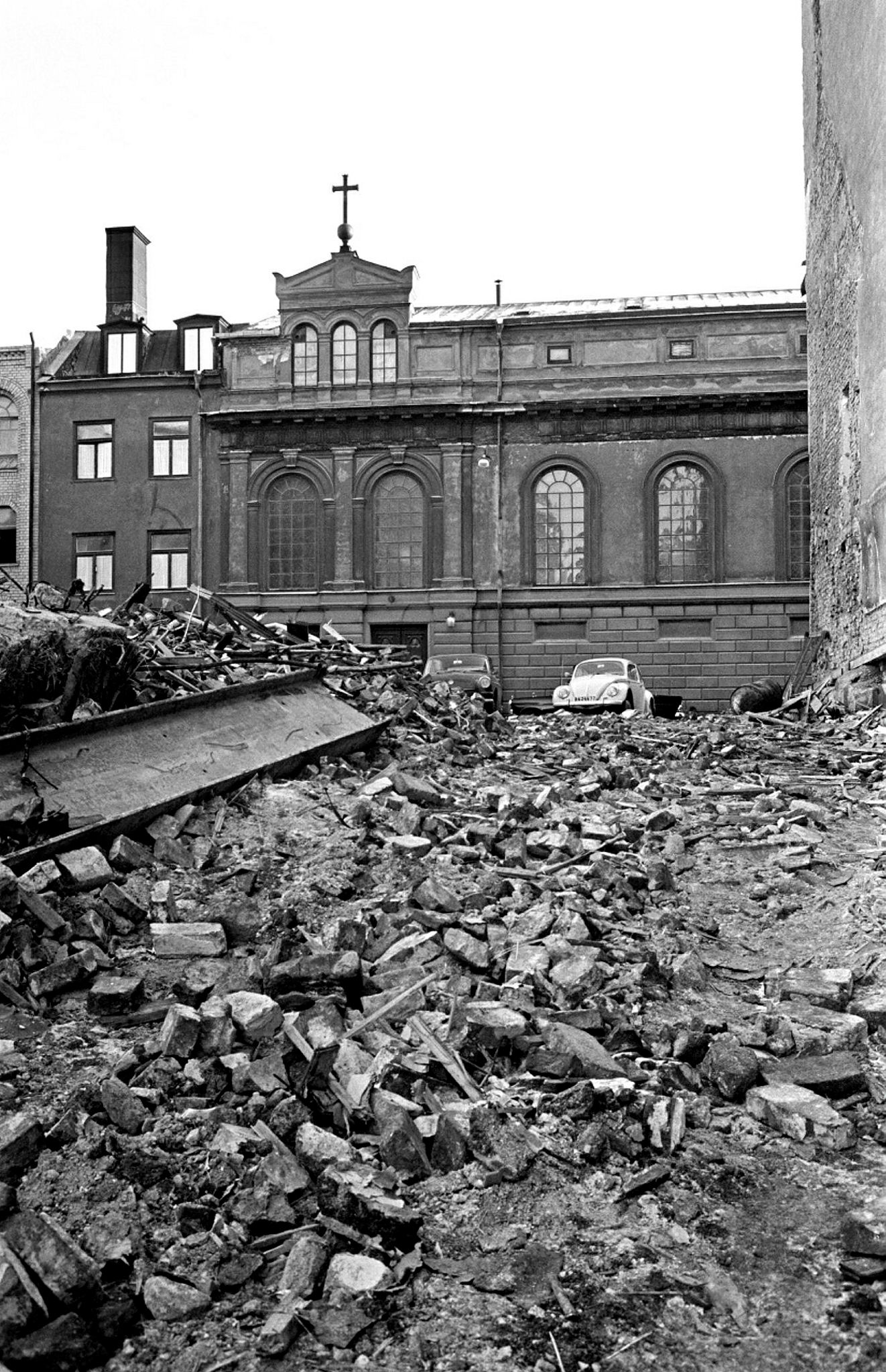 Norra Smedjegatan 17, 19 och 21 är rivna. I fonden bakom rivningsmassorna syns Sankta Eugeniakyrkan.