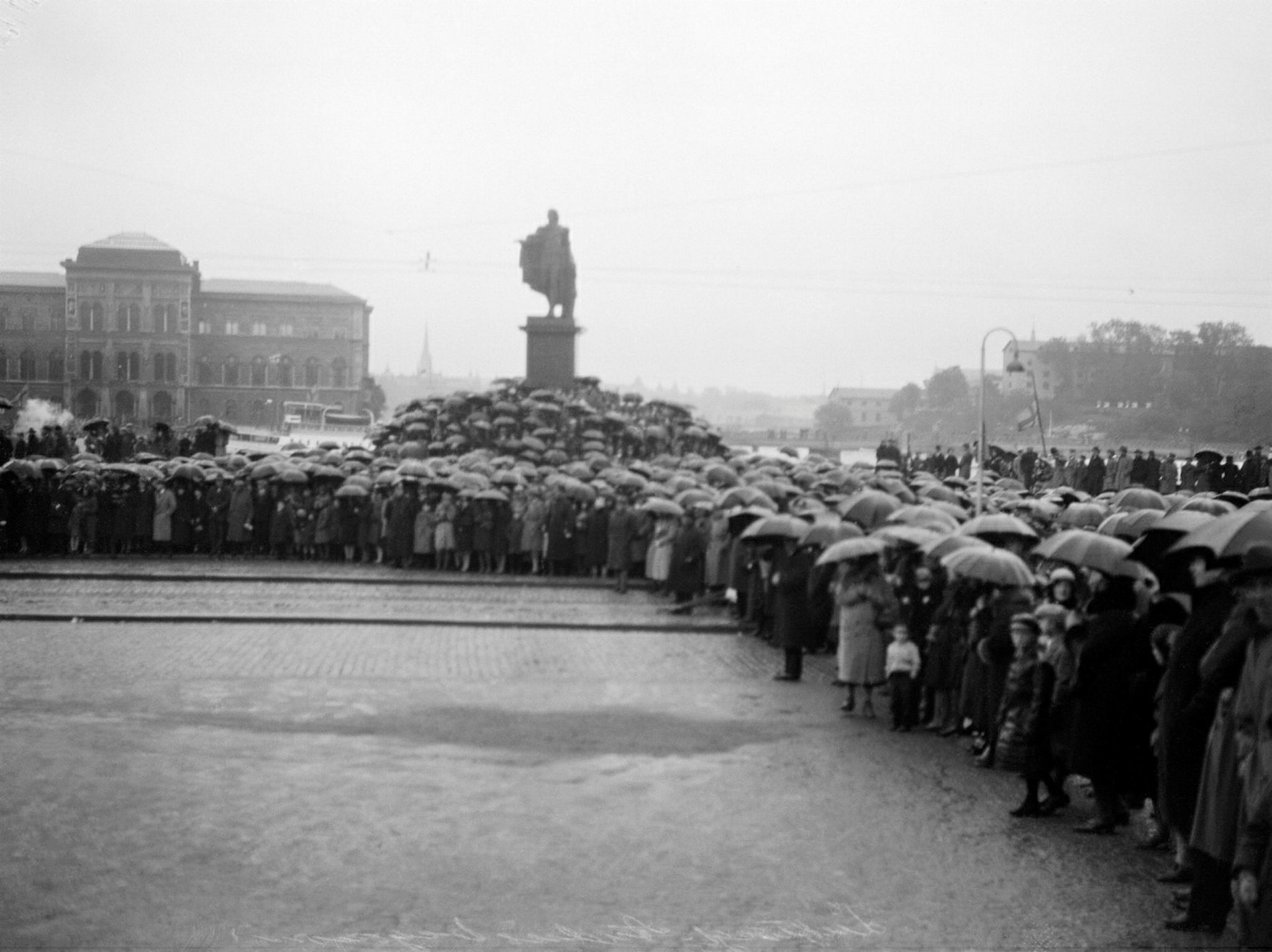 Folksamling vid Slottsbacken på Skeppsbron i väntan på begravningståget med stoftet efter de förolyckade från Andréexpeditionen. I fonden Nationalmuseet och Gustaf III:s staty.