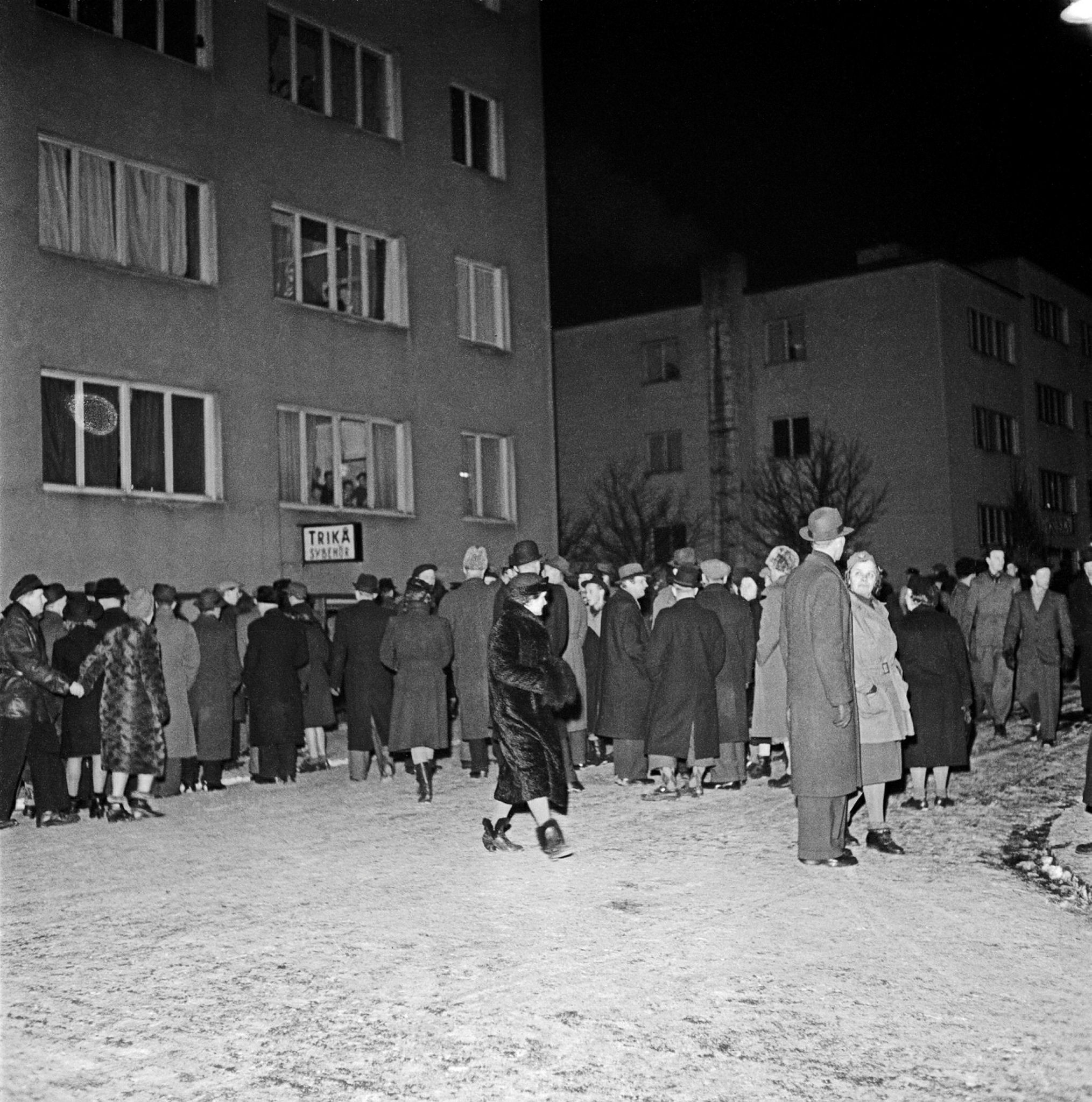 Bomber över Stockholm. Folksamling vid söndersprängda fönster efter de ryska flygbomberna.