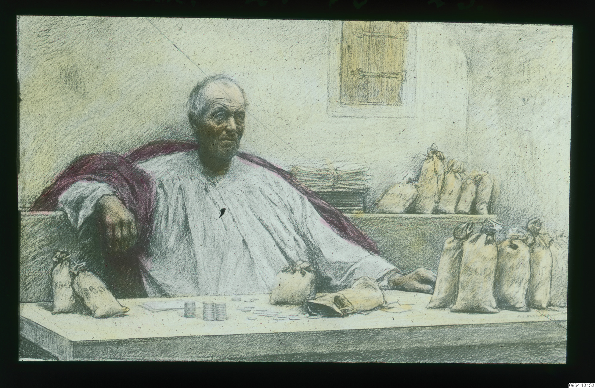 Repro av målning. Lukasevangeliet. Luk 12:15-23. "Den rike mannen", från Jesu liknelse om "den rike dåren". Målning av Eugene Burnand.