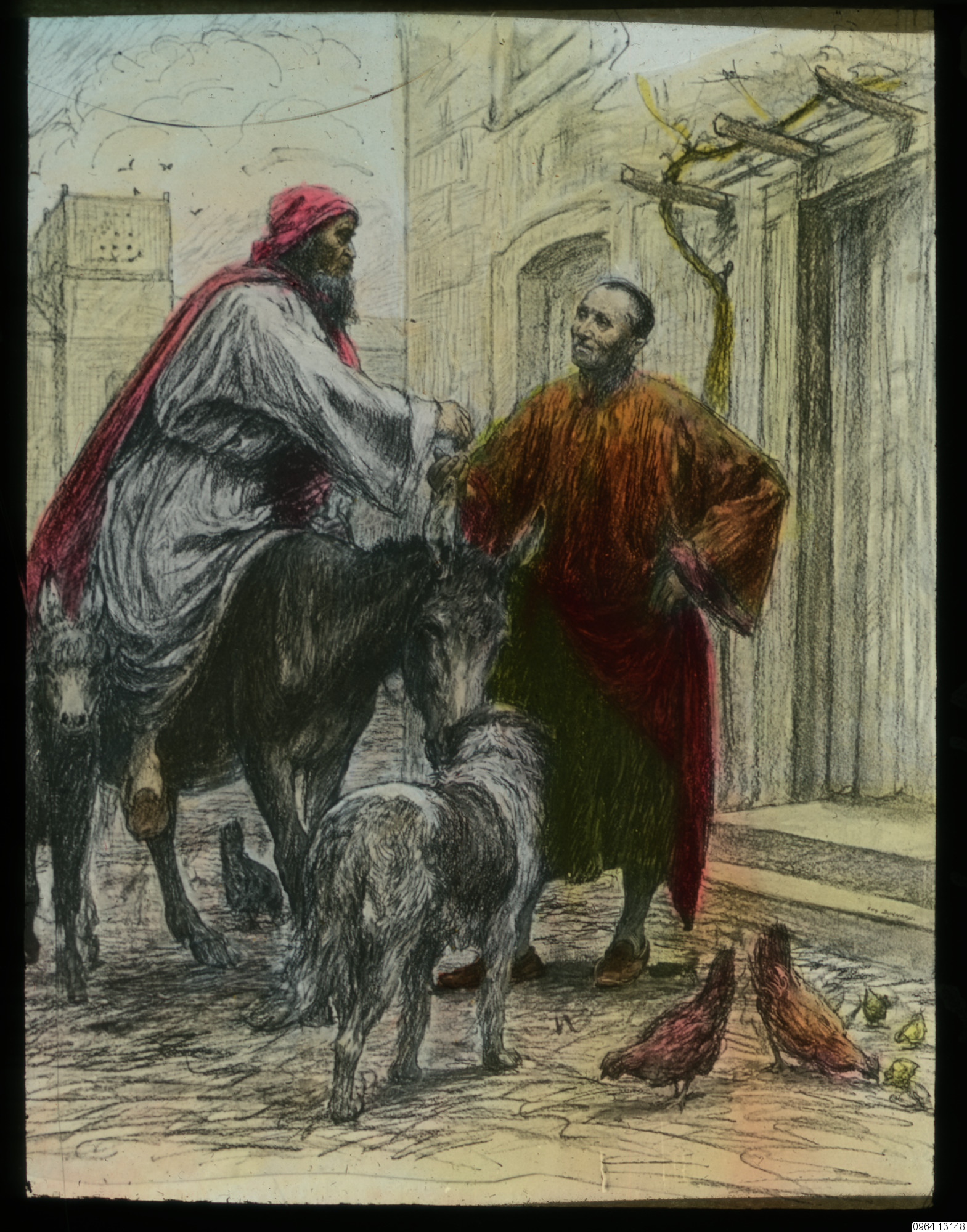 Repro av målning av Eugène Burnand. Den skildrar ett bibliskt ögonblick. Den barmhärtige samariern. Lukasevangeliet. Luke 10: 30-37.