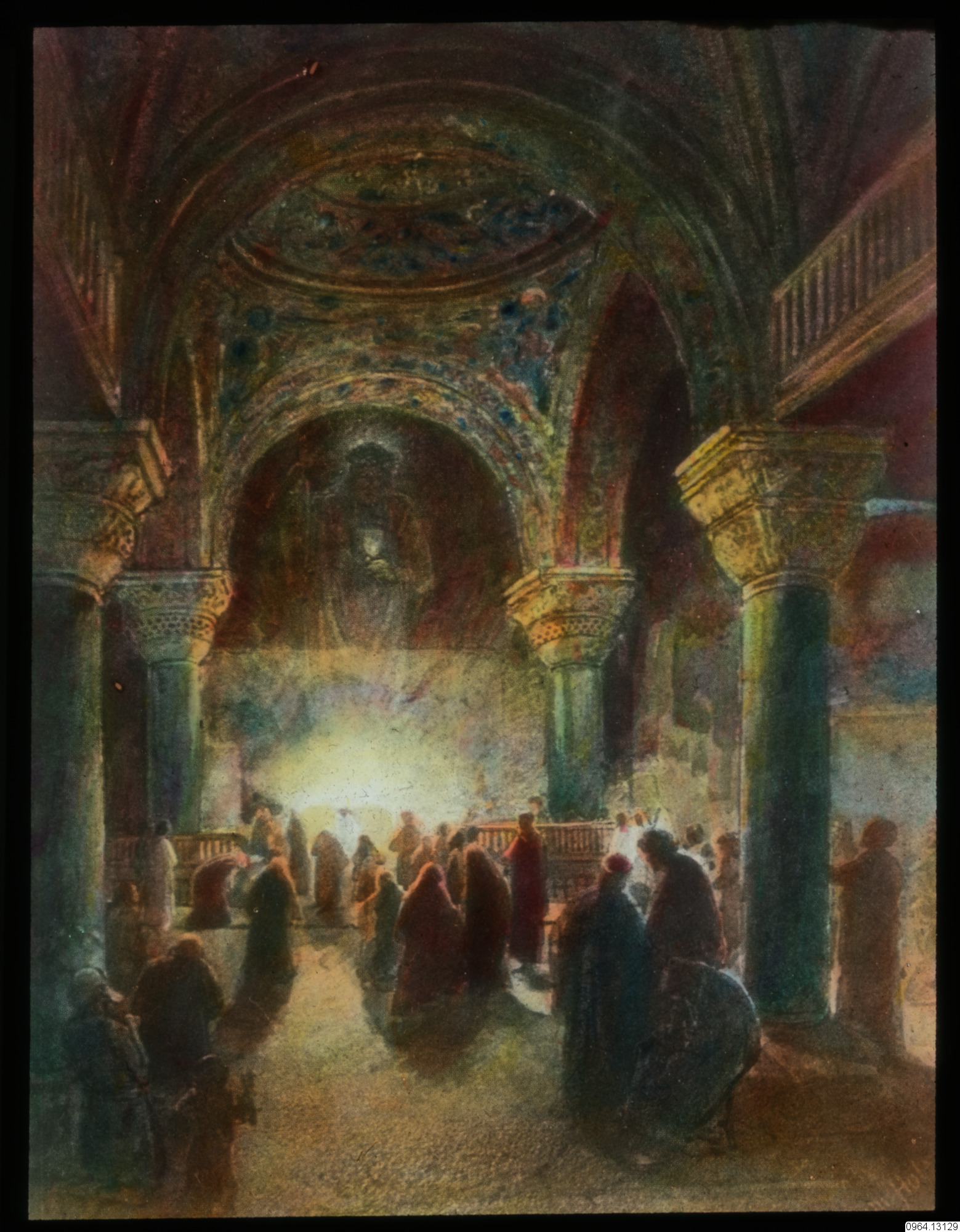 Repro av målning. Målning av konstnären William Brassey Hole. Bilden föreställer en målning med titeln "The Holy Spirit watches over a congregation" (Den Helige Ande vakar över en församling).