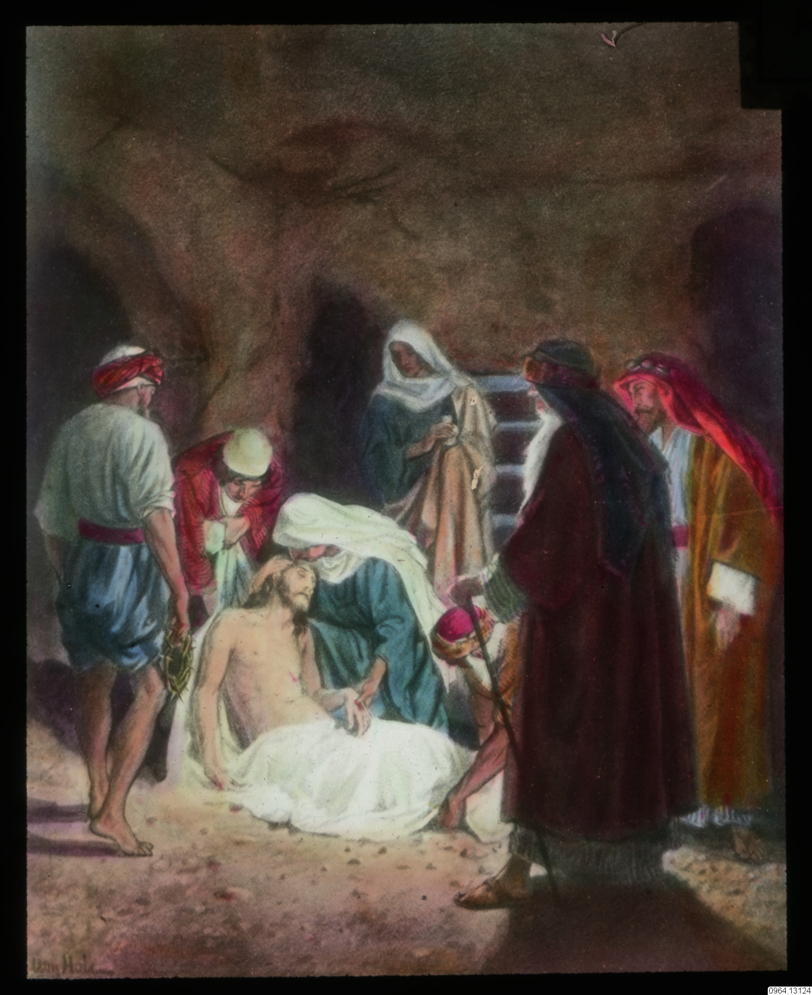 Repro av målning. Målning av konstnären William Brassey Hole som skildrar den bibliska scenen där Jesus kropp tas om hand.