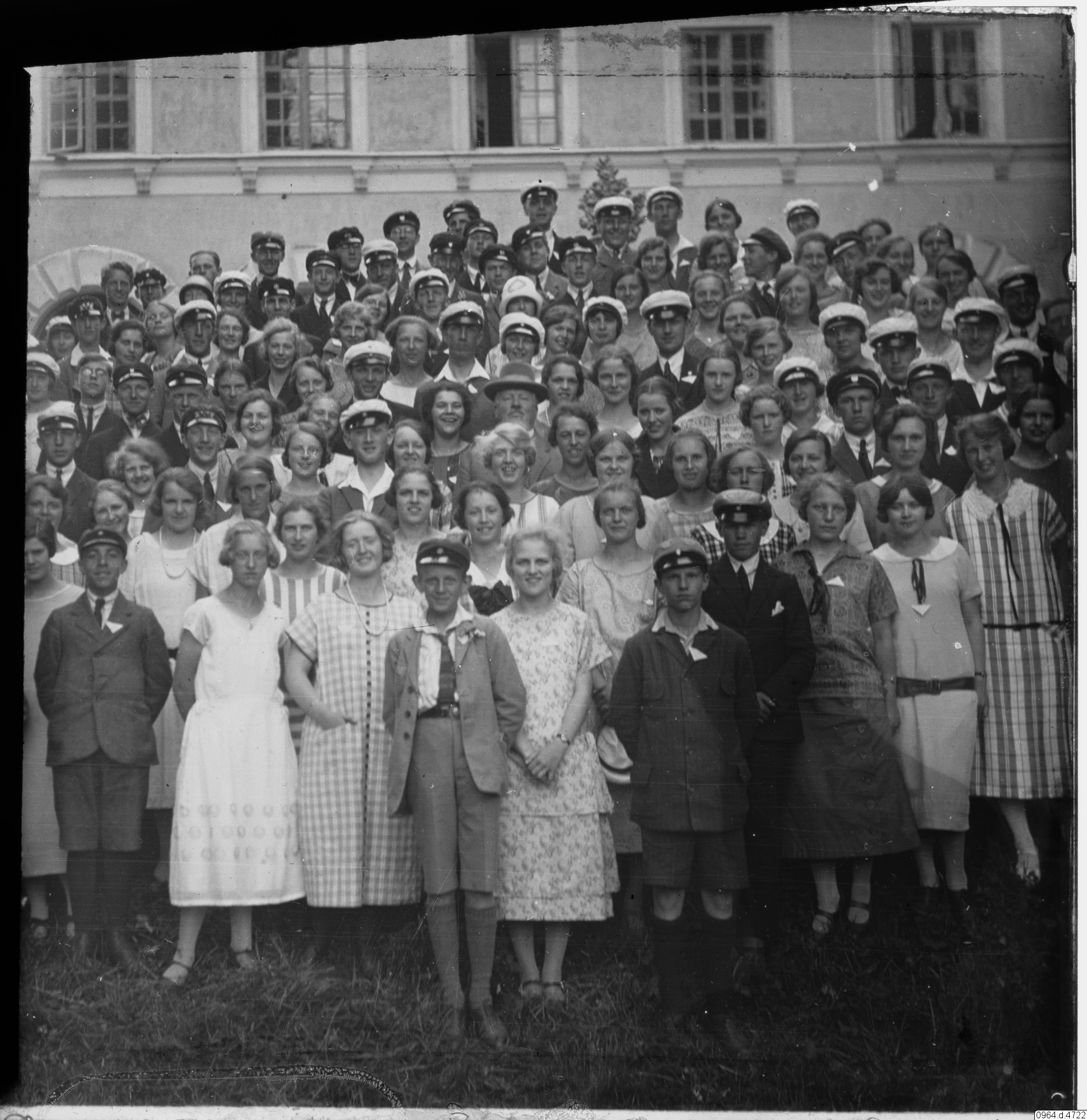 Gruppbild av ungdomar, många med studentmössor framför en byggnad.