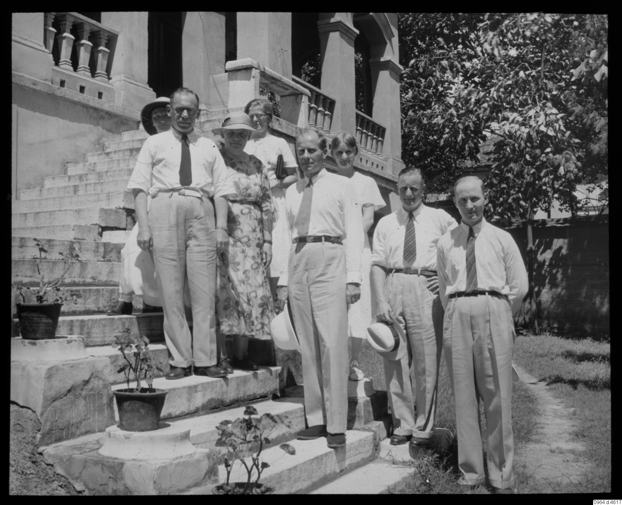 gruppbild, missionärer, krukväxter, trädgård, trappa, missionsstation, fotografi, photograph