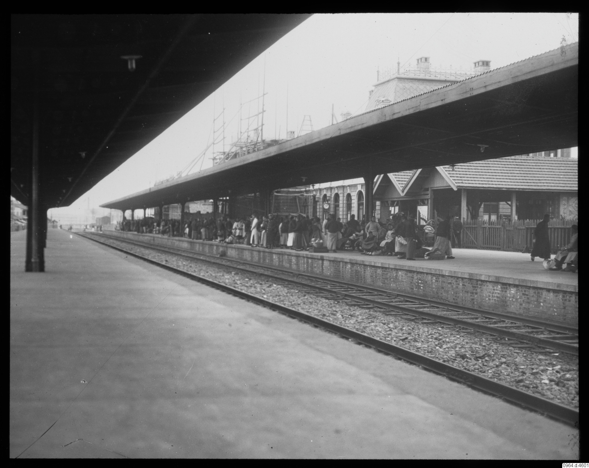 byggnader, räls, folksamling, järnvägsstation, staket, fotografi, photograph