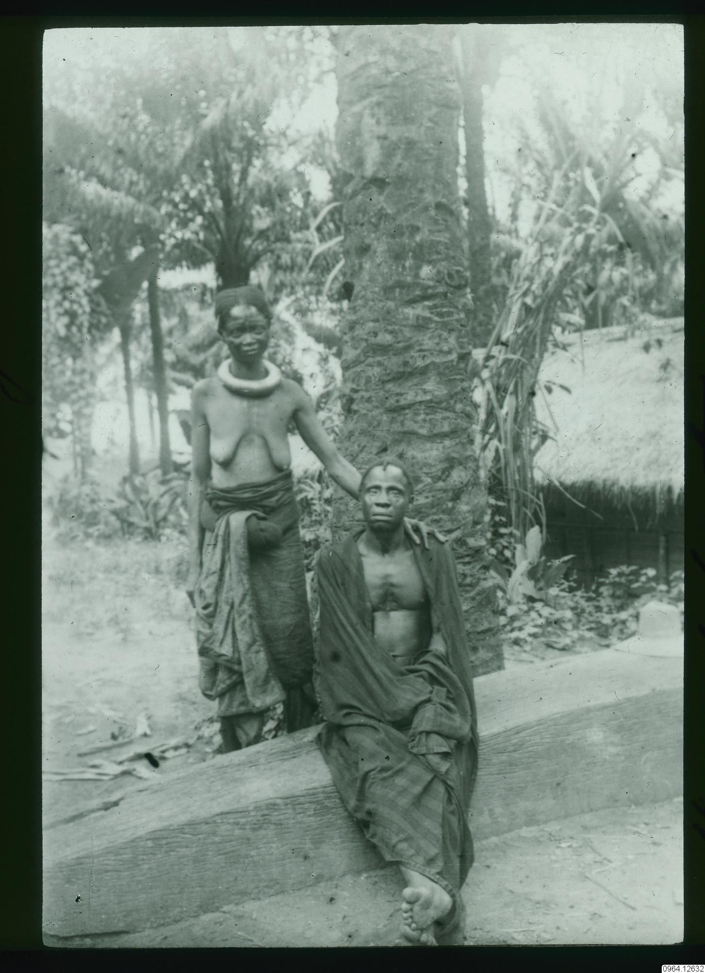 Man och hustru, traditionella kläder, kvinnan har en stor halsring. Kvinnan står, mannen sitter. Övre Kongo. "Thsumbiri"? (svårläst)