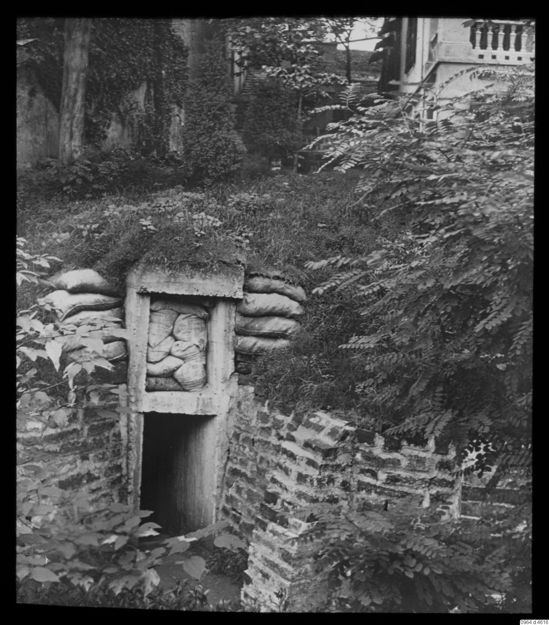 Nedgrävt skyddsrum täckt av sandsäckar vid byggnad.