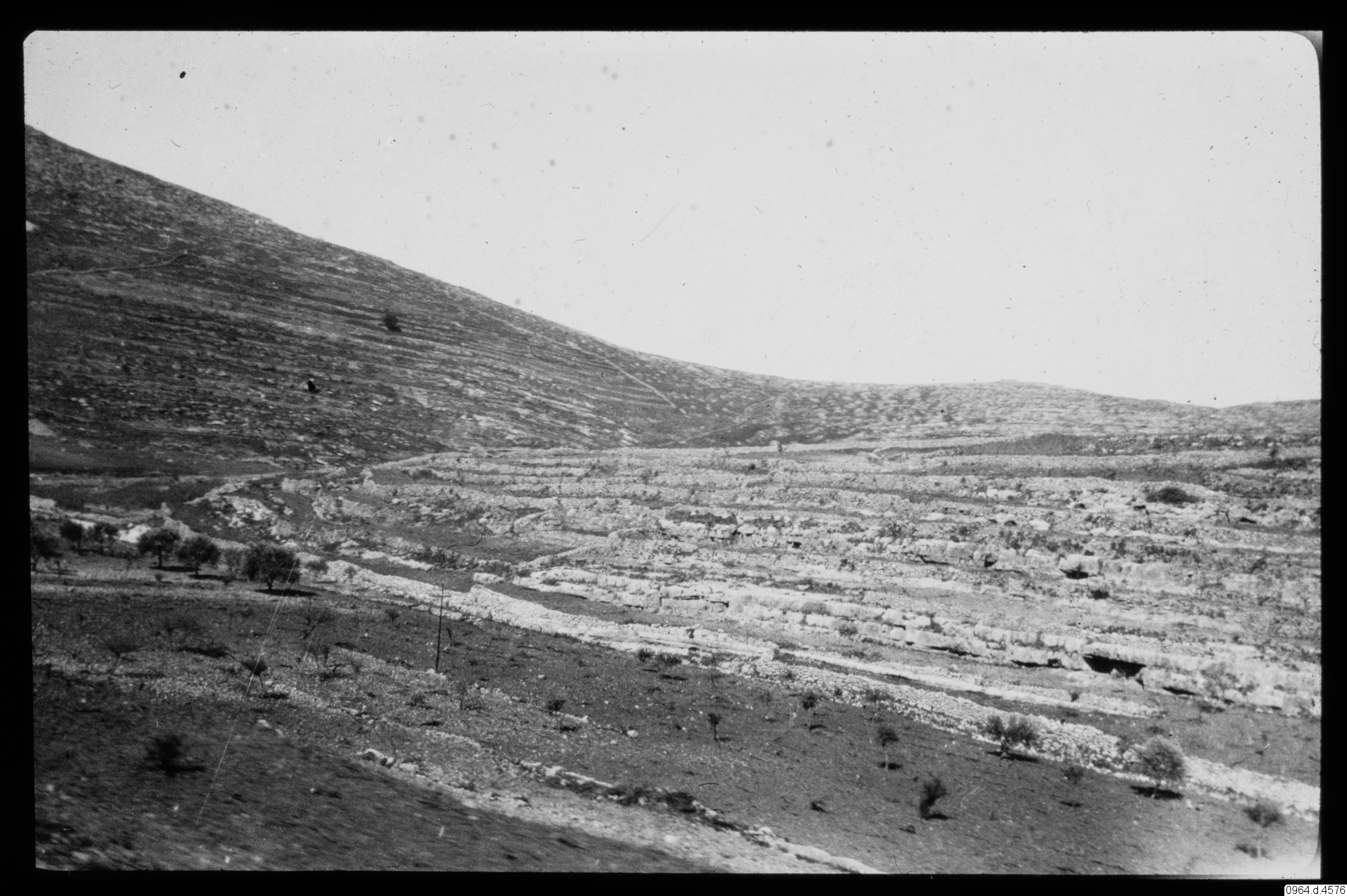 Fotograf E. Finn. Uppsala.Terasser, jordbruk och olivträd vid ett vattendrag.