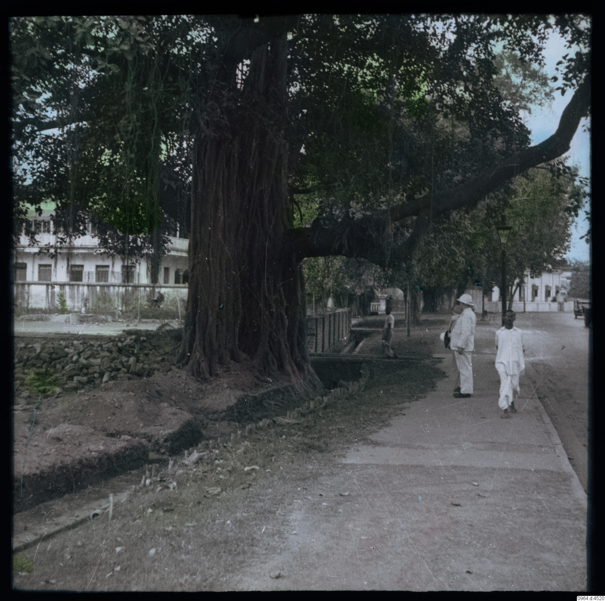 gata, personer, tropikhjälm, träd, missionärer, byggnader, fotografi, photograph