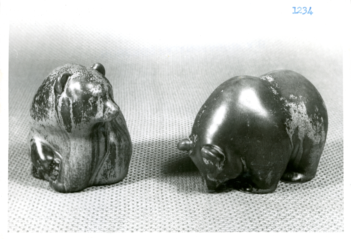 Björnfiguriner från Bo Fajans, formgivare Stig Blomberg, omkring 1900-talets mitt. Inför Bo Fajans jubileumsutställning 1949.