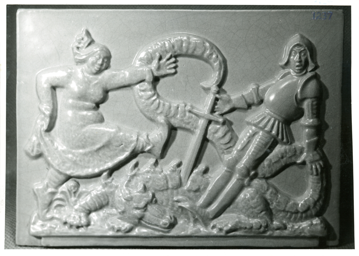 Väggrelief St. Göran, draken och prinsessan från Bo Fajans, formgivare Karl Hultström, omkring 1900-talets mitt.