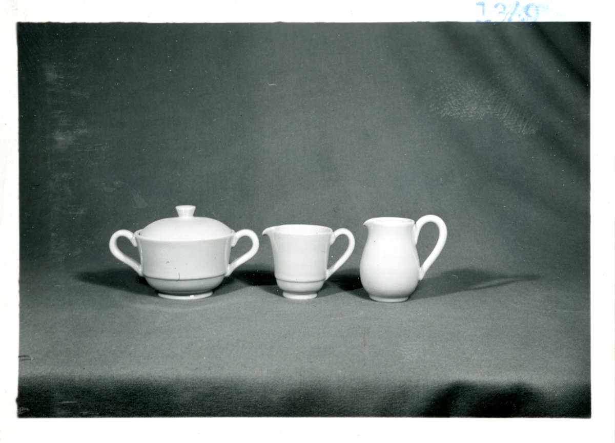 Skål med lock och handtag samt två gräddkannor från Bo Fajans, omkring 1900-talets mitt.