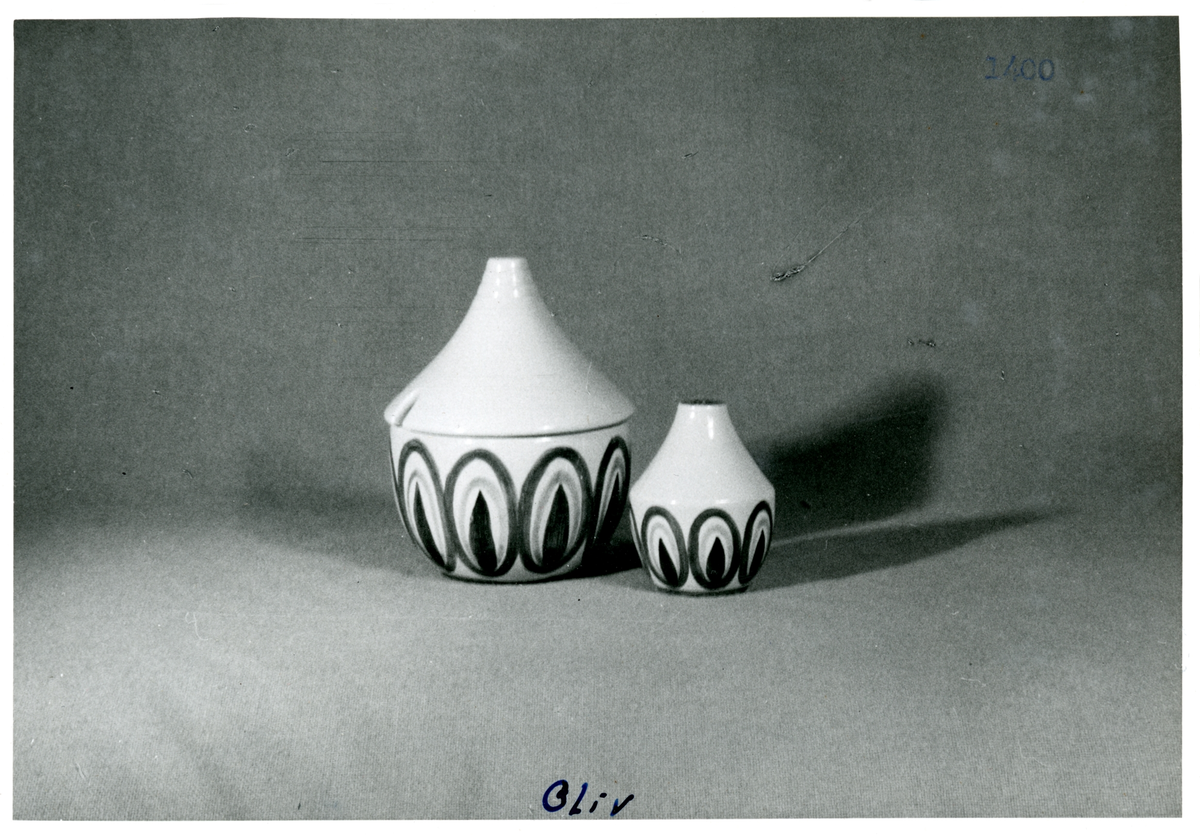 Marmeladburk med salt- eller sockerströare från Bo Fajans, formgivare Berit Ternell, omkring 1900-talets mitt. Dekor Oliv.