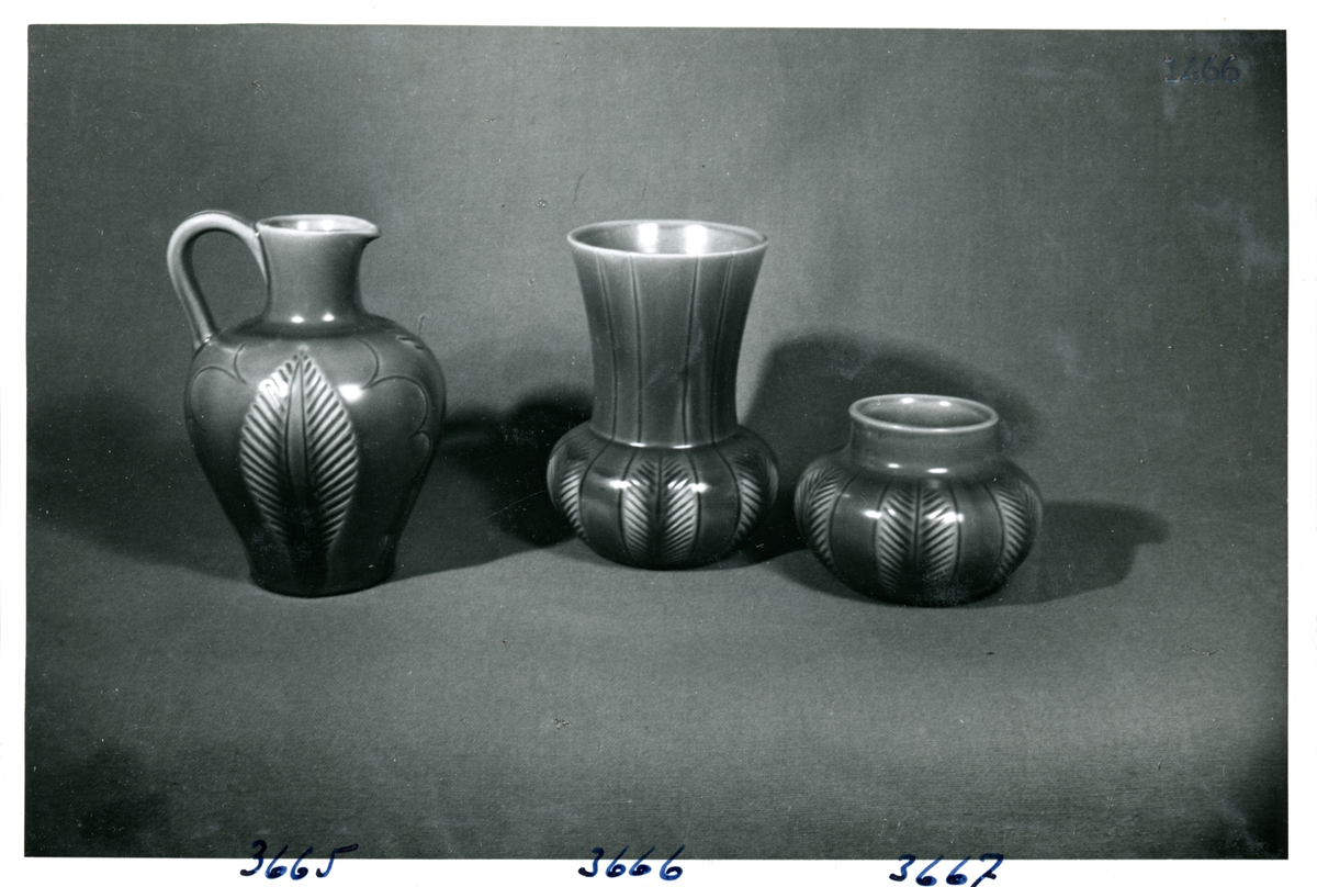 Krus och två vaser från Bo Fajans, formgivare Eva Jancke-Björk, omkring 1900-talets mitt.