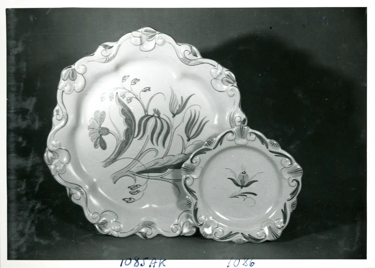 Tårtfat 1085 AK och assiett 1056 från Bo Fajans, formgivare Allan Ebeling, tidigt 1900-tal.