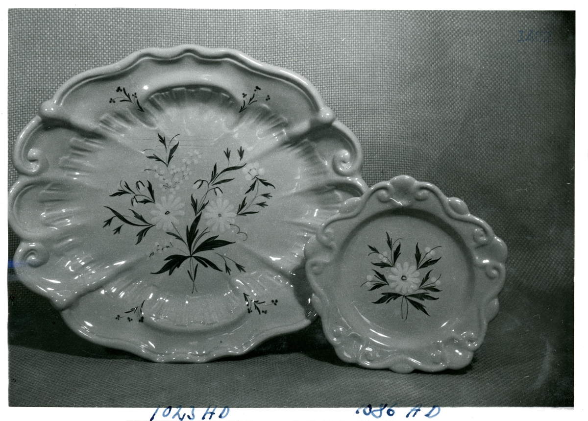 Fruktfat 1023 HD och assiett 1086 AD från Bo Fajans, formgivare Allan Ebeling, tidigt 1900-tal.