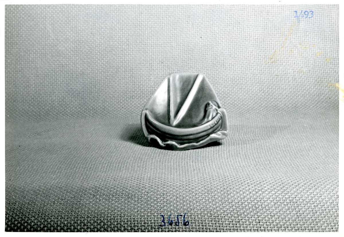 Keramiskaföremål 3656 med en segelbåt på havet i relief från Bo Fajans, formgivare Eva Jancke-Björk, omkring 1900-talets mitt.
