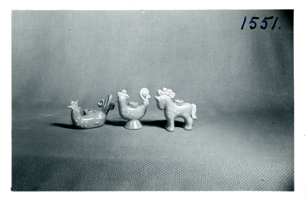 Ljusstakar i form av höna, tupp och häst från Bo Fajans, formgivare Eva Jancke-Björk, omkring 1900-talets mitt.