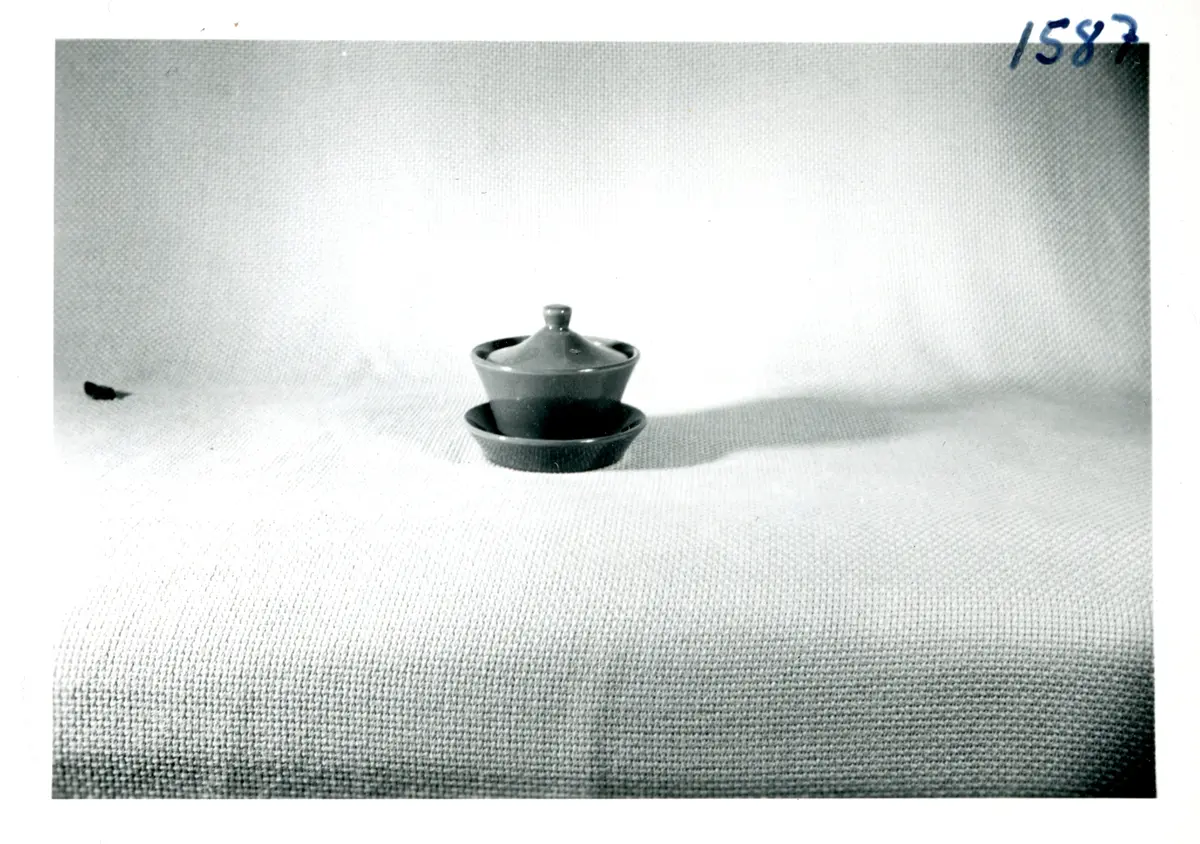 Burk med lock 3739 samt fat 3741 från Bo Fajans, formgivare Eva Jancke-Björk, omkring 1900-talets mitt.