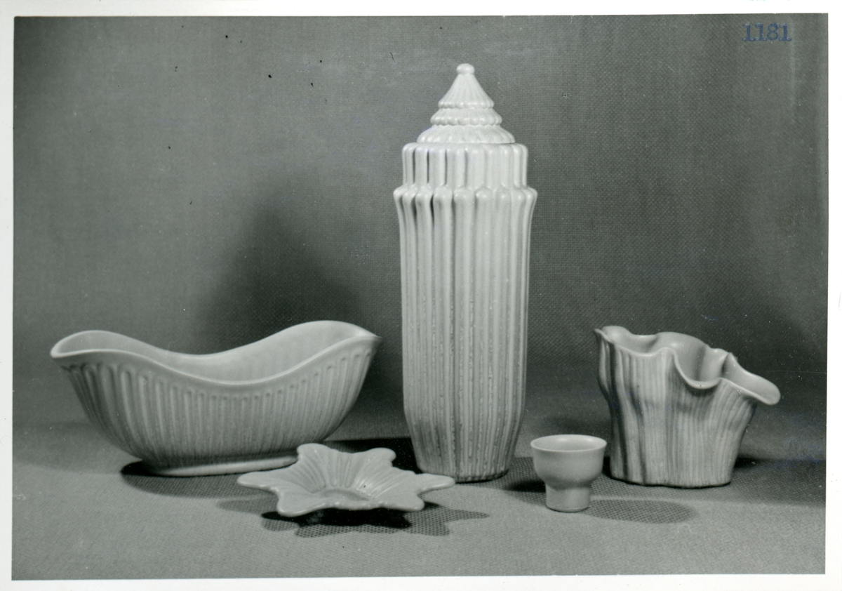 Bojan och skålar från Bo Fajans, omkring 1900-talets mitt. Sjö och havstema.
