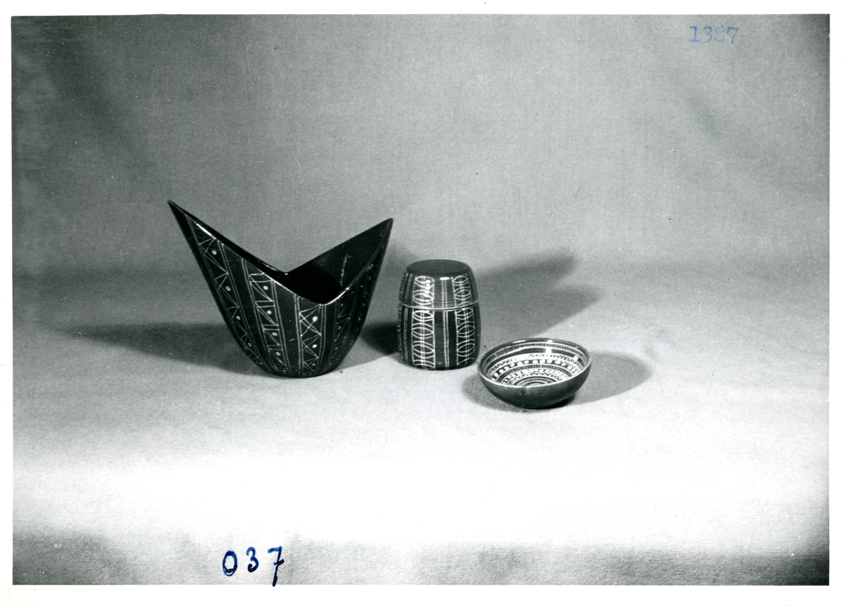 Skål, burk med lock samt en liten skål från Bo Fajans, formgivare Berit Ternell, omkring 1900-talets mitt.