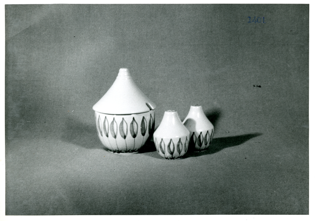Marmeladburk med salt- och sockerströare från Bo Fajans, formgivare Berit Ternell, omkring 1900-talets mitt.