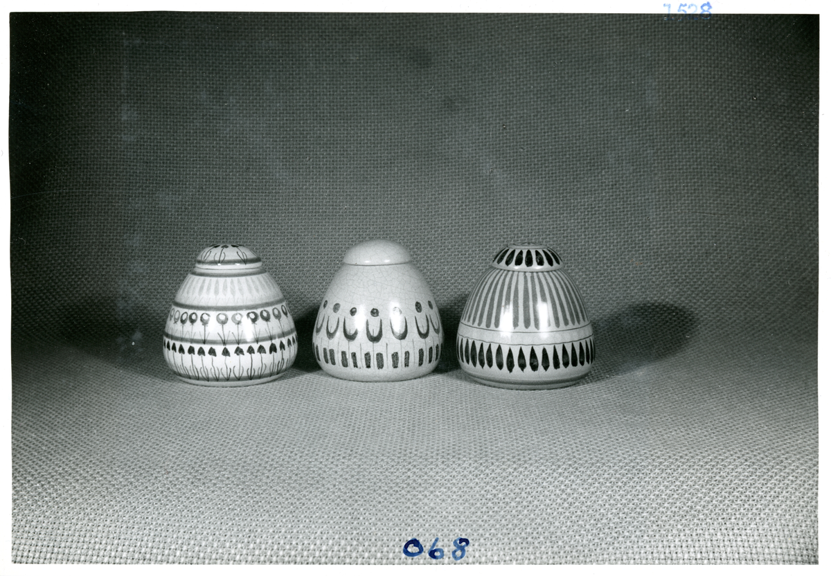 Burkar 068 i olika dekor från Bo Fajans, formgivare Berit Ternell, omkring 1900-talets mitt.