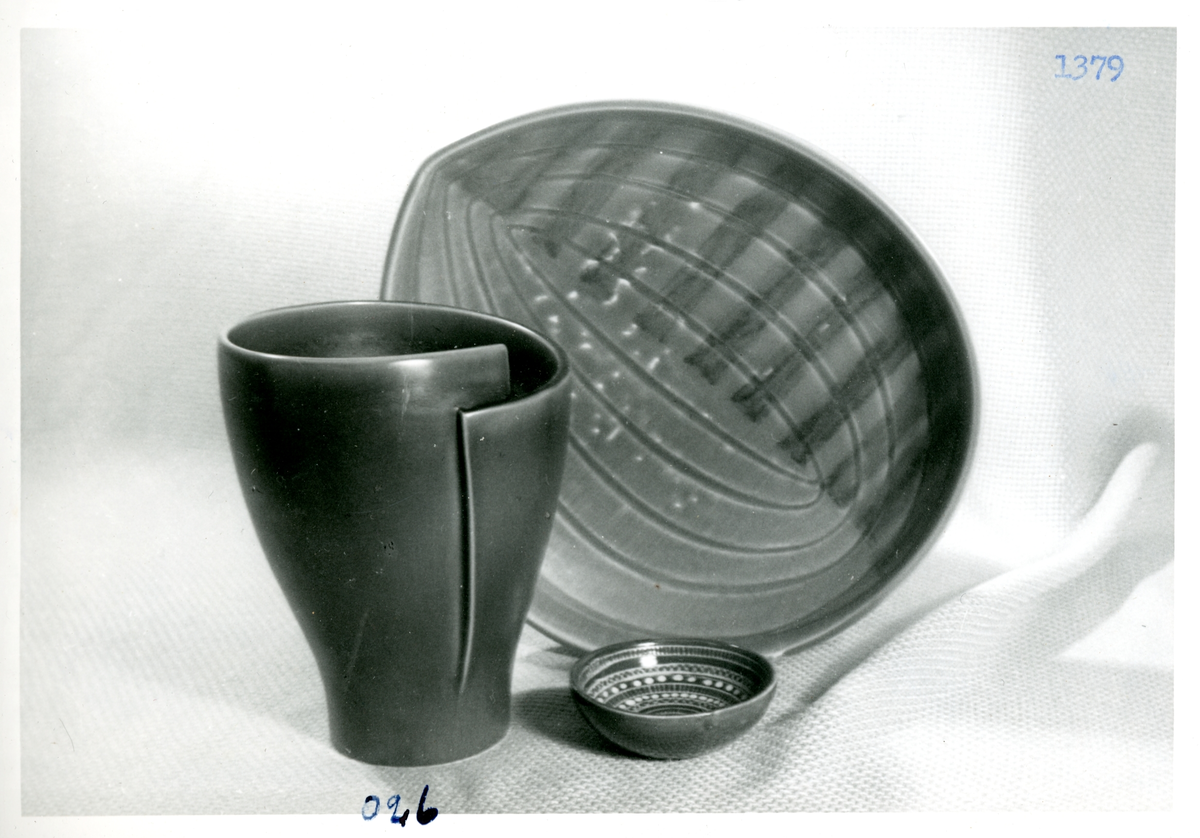 Vas, liten skål och assiett från Bo Fajans, formgivare Berit Ternell, omkring 1900-talets mitt.