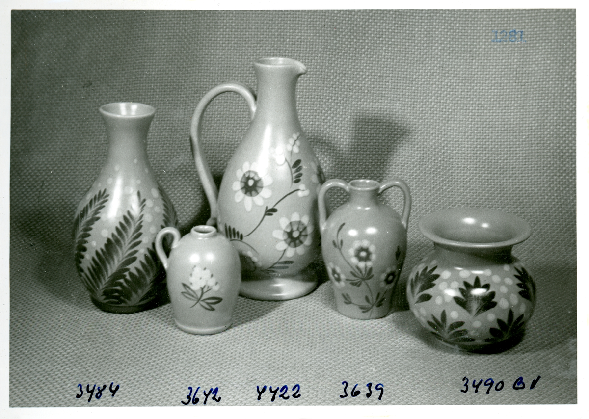 Vaser, krus samt likörkrus från Bo Fajans, formgivare Eva Jancke-Björk, omkring 1900-talets mitt.