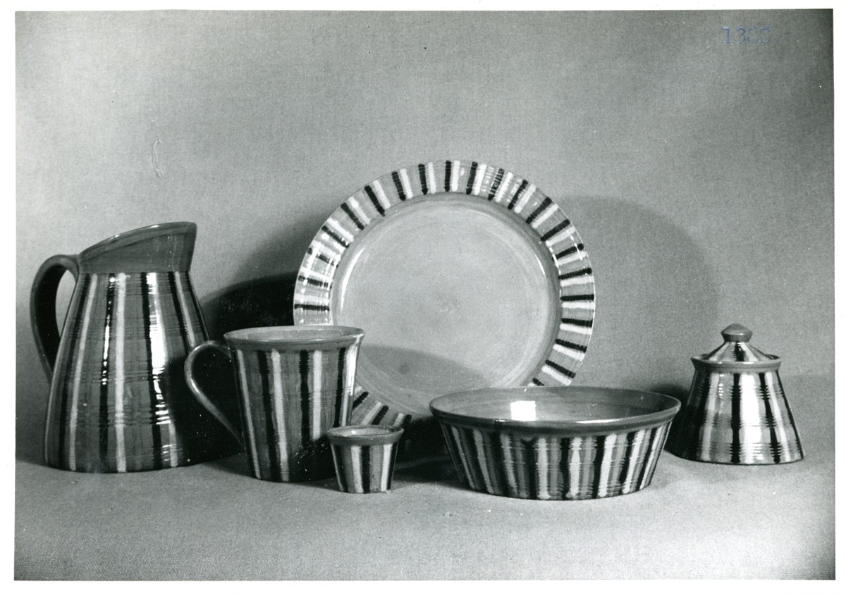 Servis från Bo Fajans, formgivare Berit Ternell, omkring 1900-talets mitt. Kanna, mugg, äggkoppp, tallrik, skål samt marmeladburk.