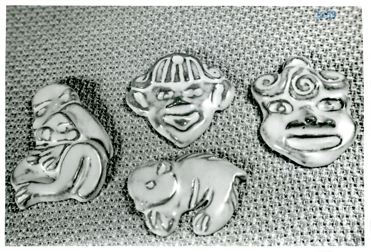 Platta figuriner från Bo Fajans, formgivare Maud Fredin-Fredholm, omkring 1900-talets mitt. Två stycken ansikten, ett lamm samt två apor som kramas.