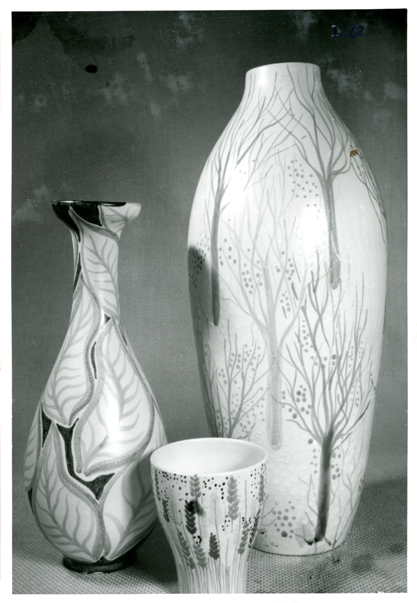 Vaser (bland annat golvvasen "Vår") och bägare från Bo Fajans, formgivare Maud Fredin-Fredholm, omkring 1900-talets mitt.