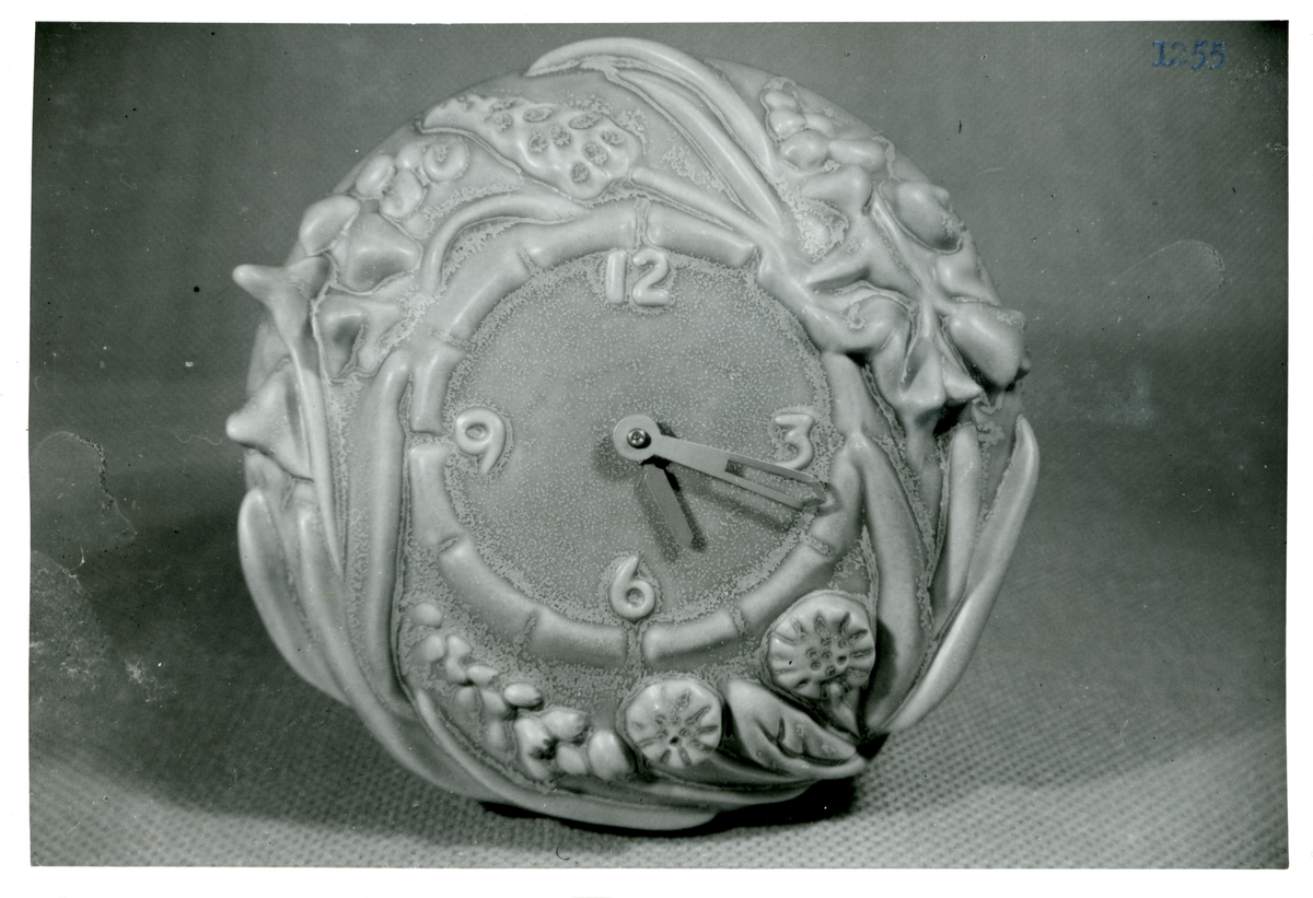 Urtavla i blå, grön och svart gul slasyr samt reliefkant från Bo Fajans, formgivare Maud Fredin-Fredholm, omkring 1900-talets mitt. Reliefen föreställer olika sorters blommor.