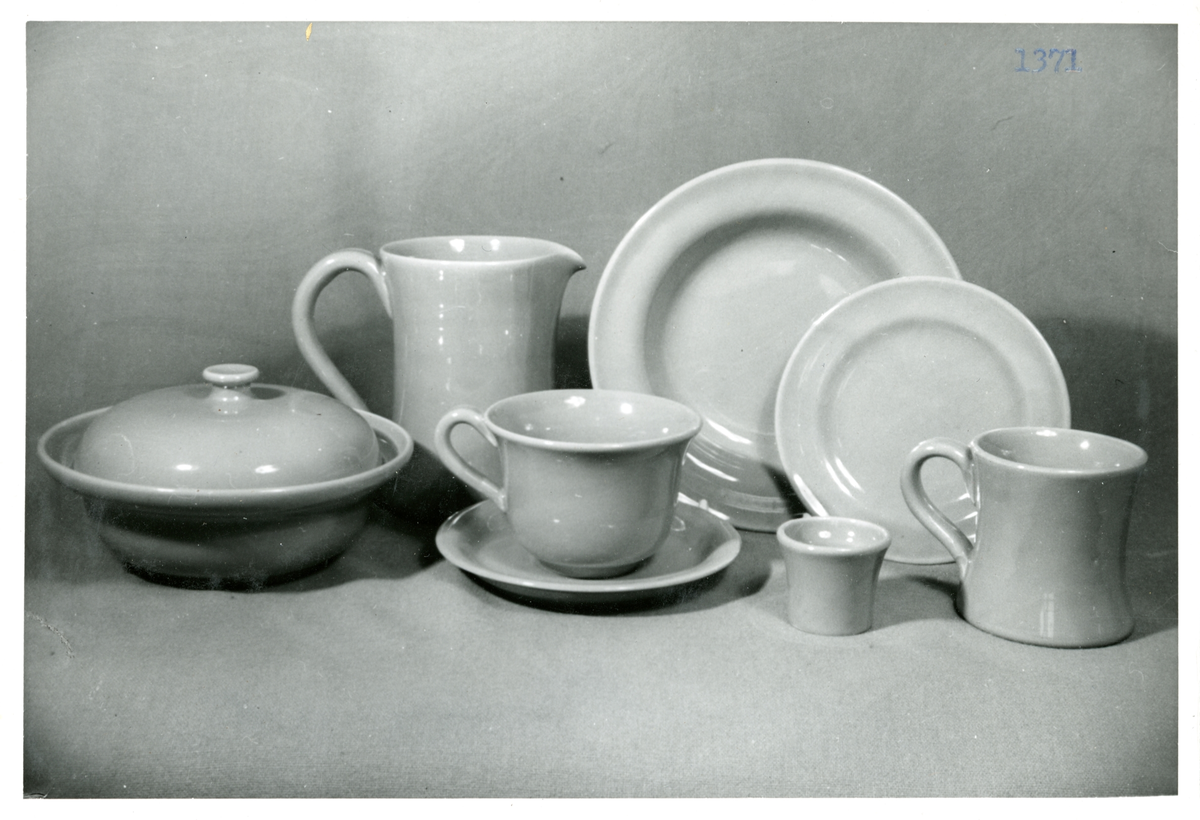 Servis från Bo Fajans, omkring 1900-talets mitt. Karott, tillbringare, kopp med fat, äggkopp, fat, asisett samt mugg.