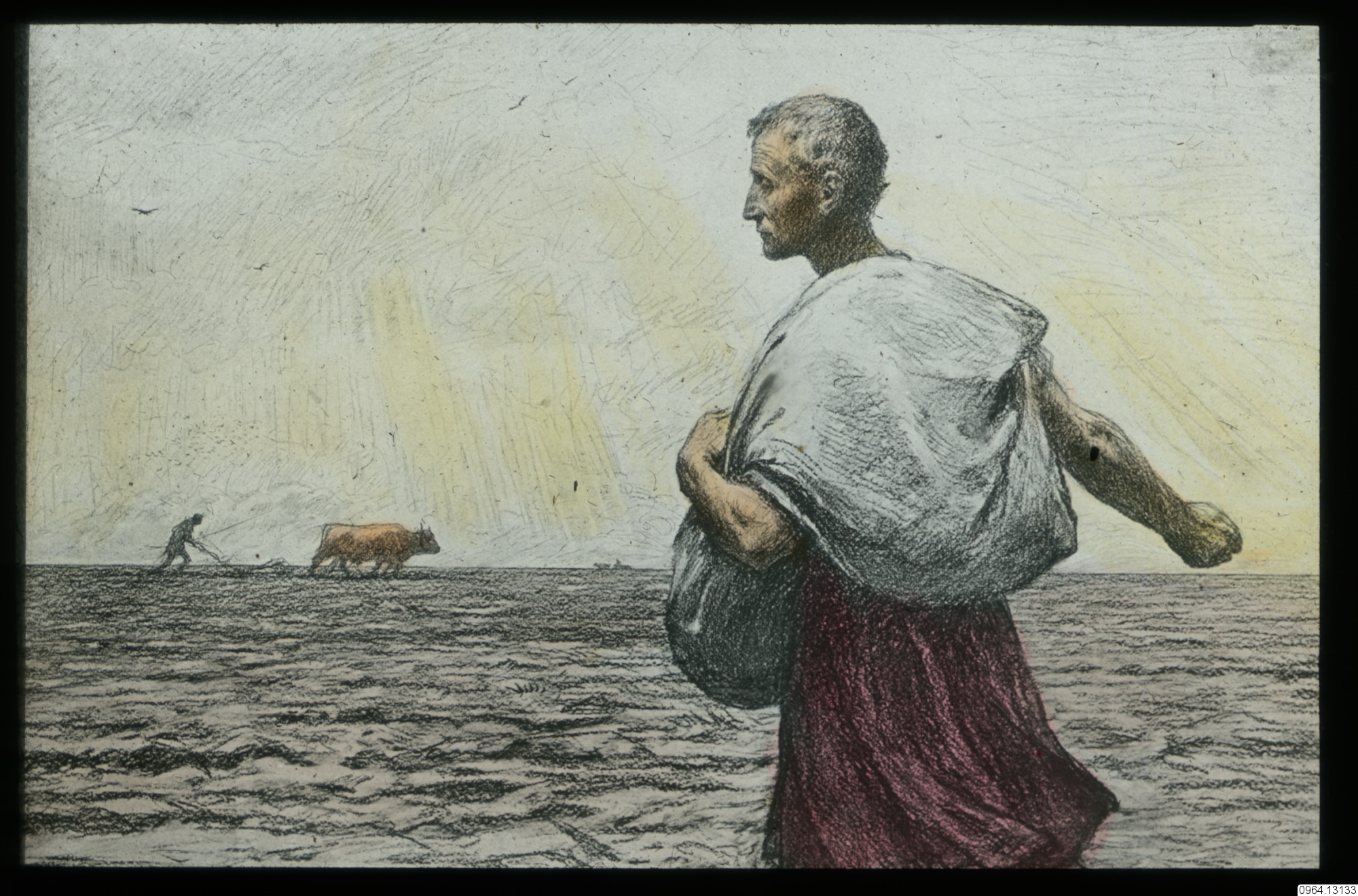 Repro av målning av Eugène Burnand "The Sower". Målningen illustrerar liknelsen om såningsmannen från Matteusevangeliet (Matteus 13:3-9), där en man sår frön i olika typer av jord.