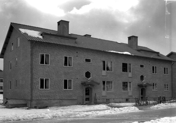 Två-våningshus i fasadtegel med källare vid gata, samt cyklar och sparkar uppställda på framsidan.