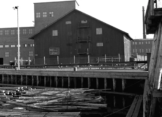 Timmer vid kaj, samt större byggnader bakom staket.