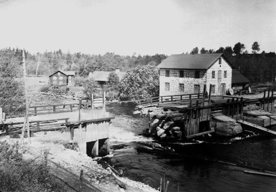 Byggnader vid vattendrag, samt rasad bro i skogsbygd.