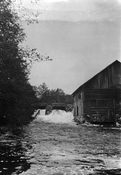 Större träbyggnad vid vattendamm, samt en bro.